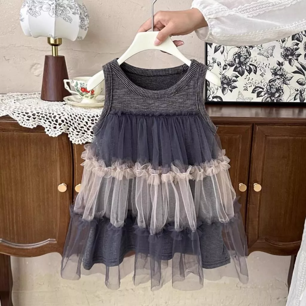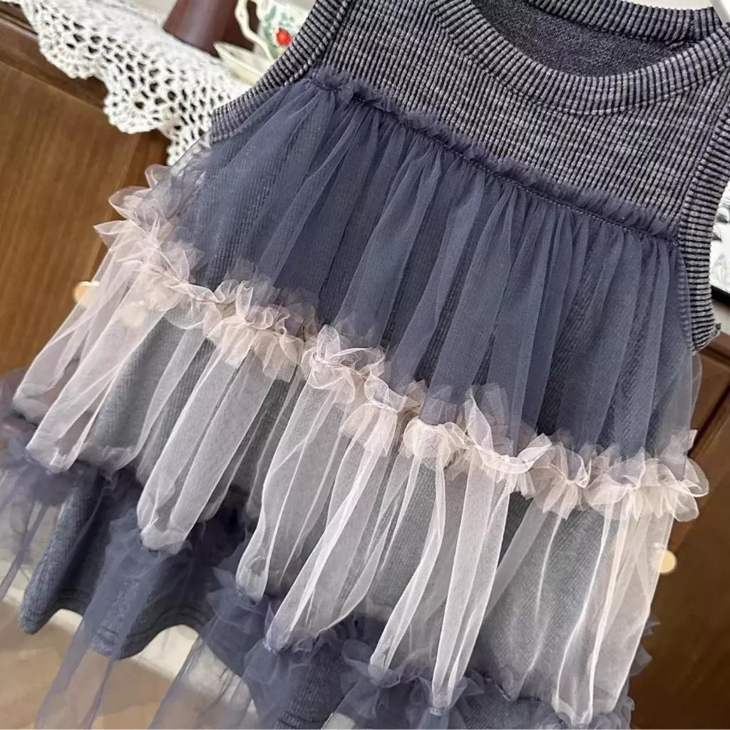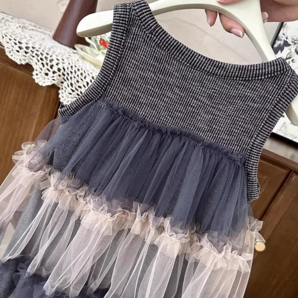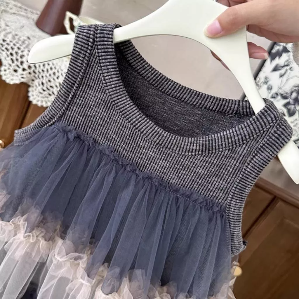 灰色拼接網紗連衣裙